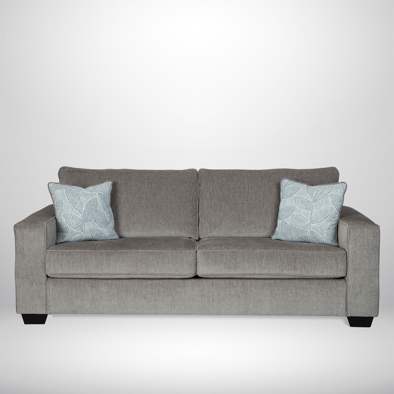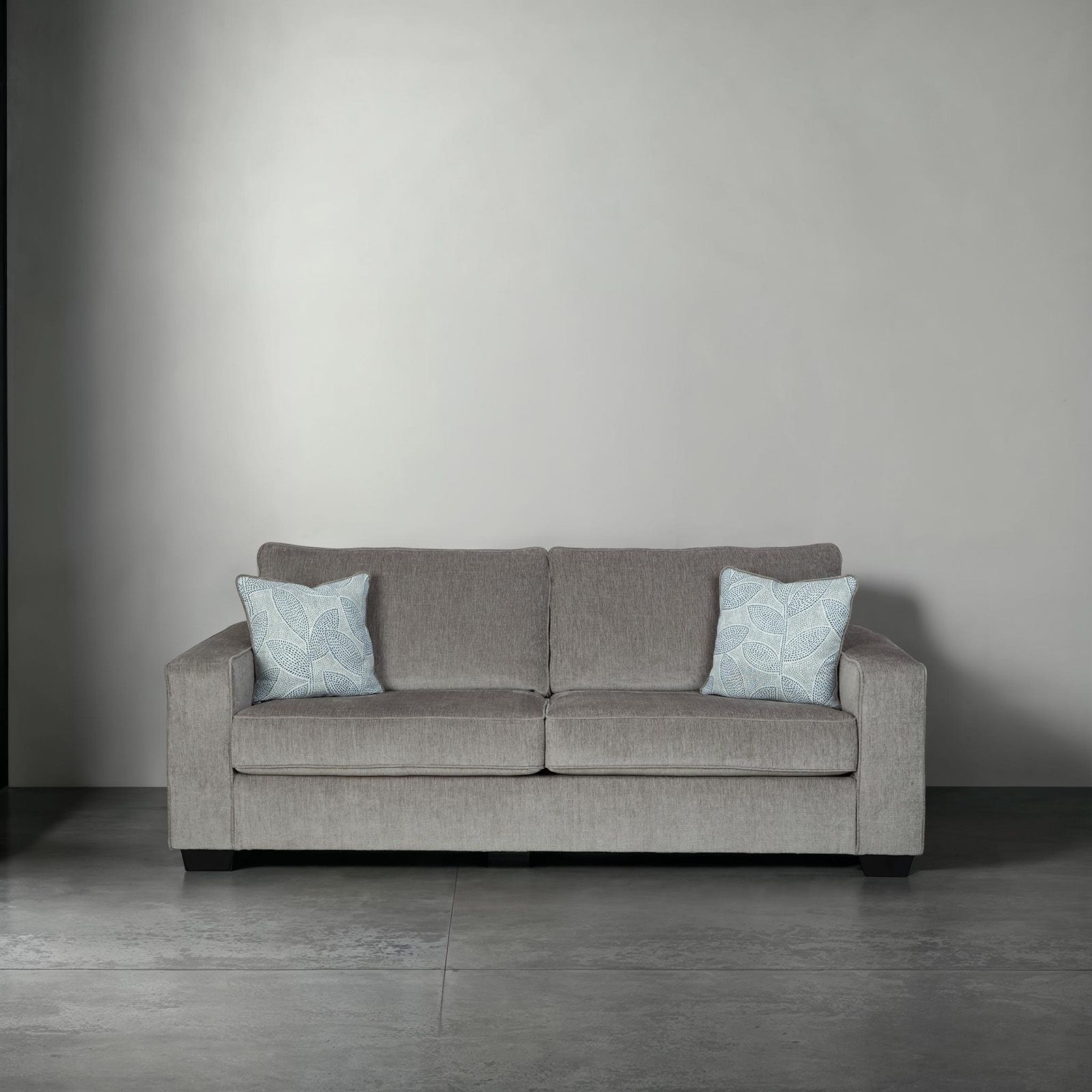 This transitional sofa has the qualities of a stylish tailored suit. Features box seat cushions and attached back cushions. Track arms and matching welt trim complete the more modern look. Two coordinated accent pillows compliment the durable slate gray upholstery.