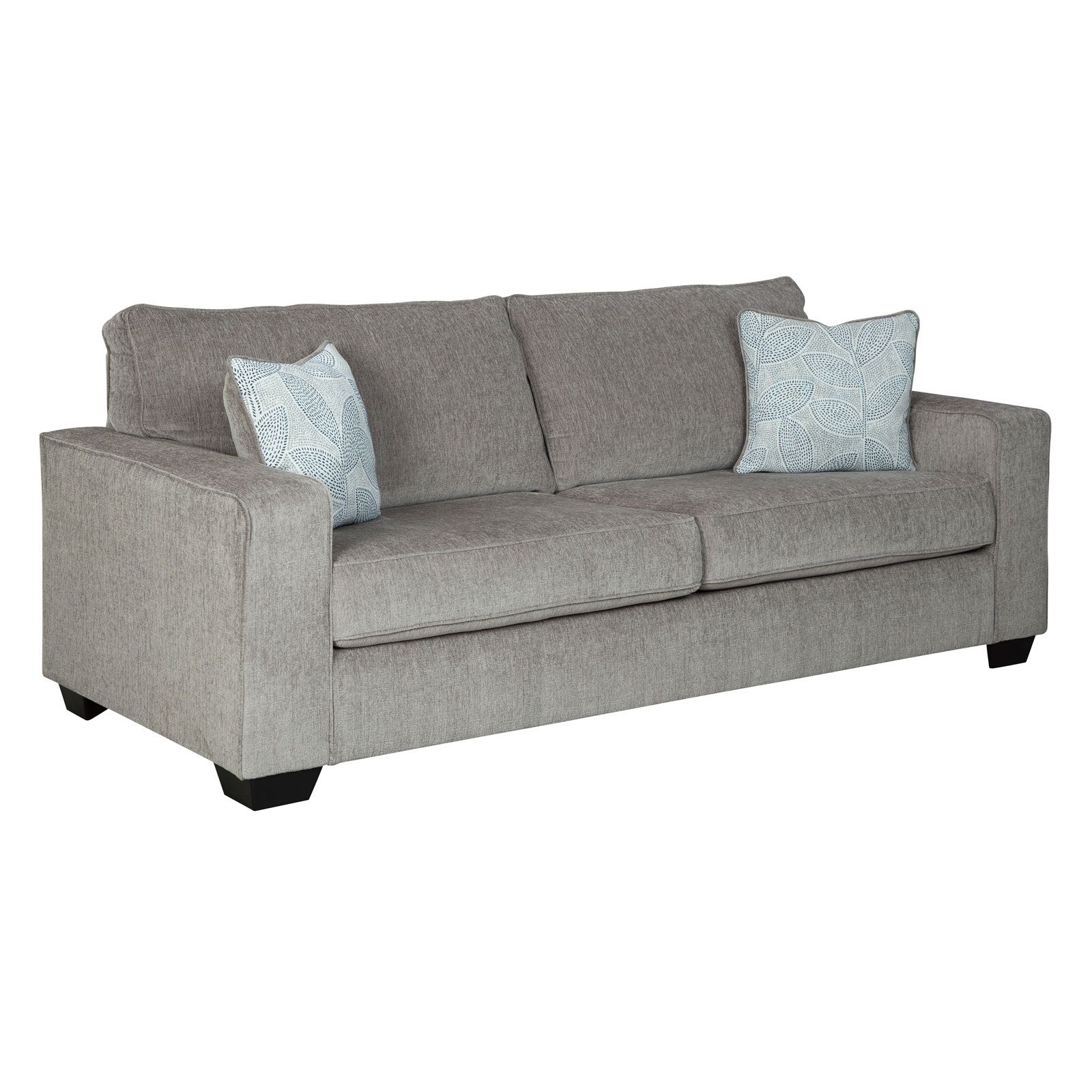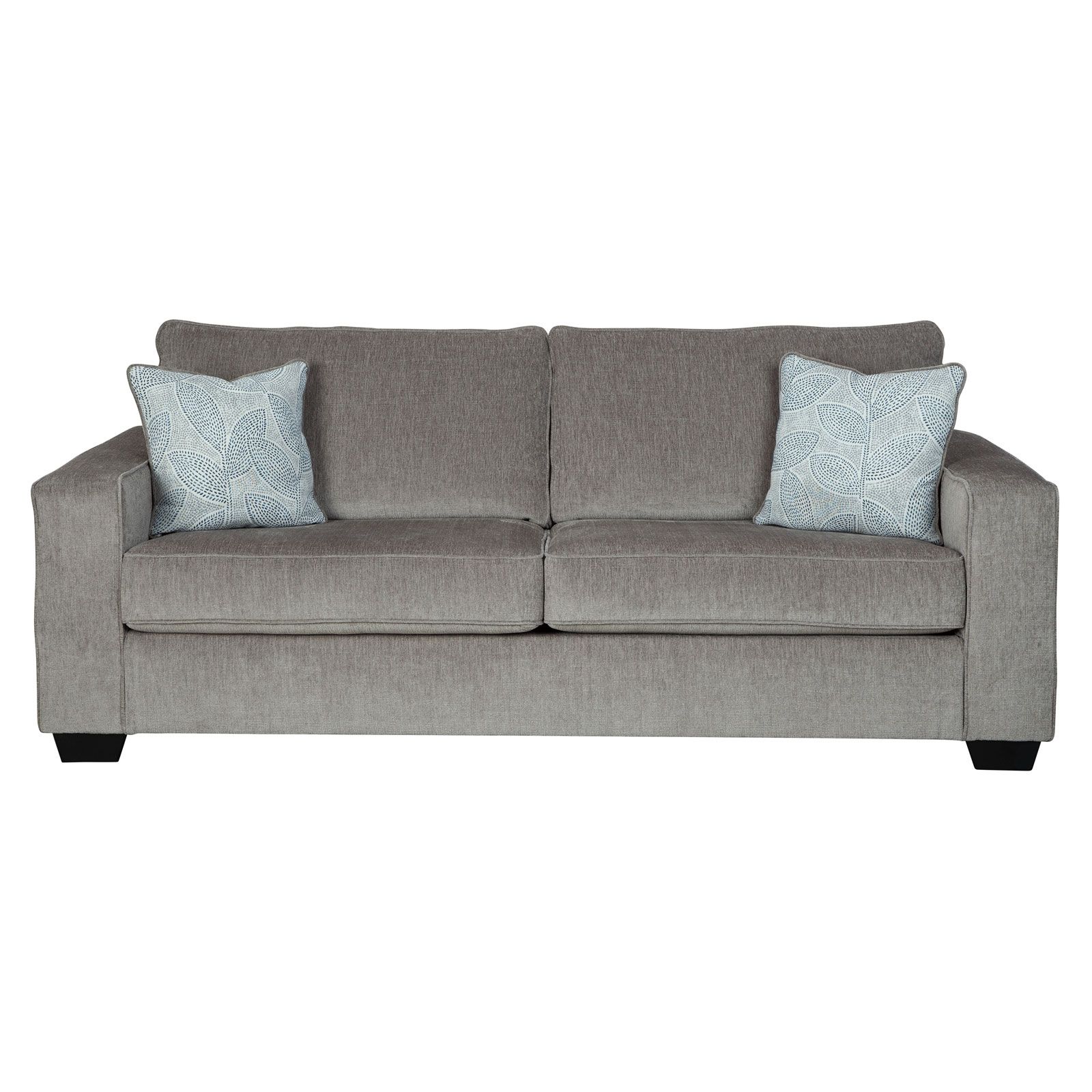 This transitional sleeper sofa has the qualities of a stylish tailored suit. Features box seat cushions and attached back cushions. Track arms and matching welt trim complete the more modern look. 2 coordinated accent pillows compliment the durable slate gray upholstery. Queen size mattress and sturdy frame easily pull out. Pamper your guests with this comfortable memory foam mattress to sleep on.