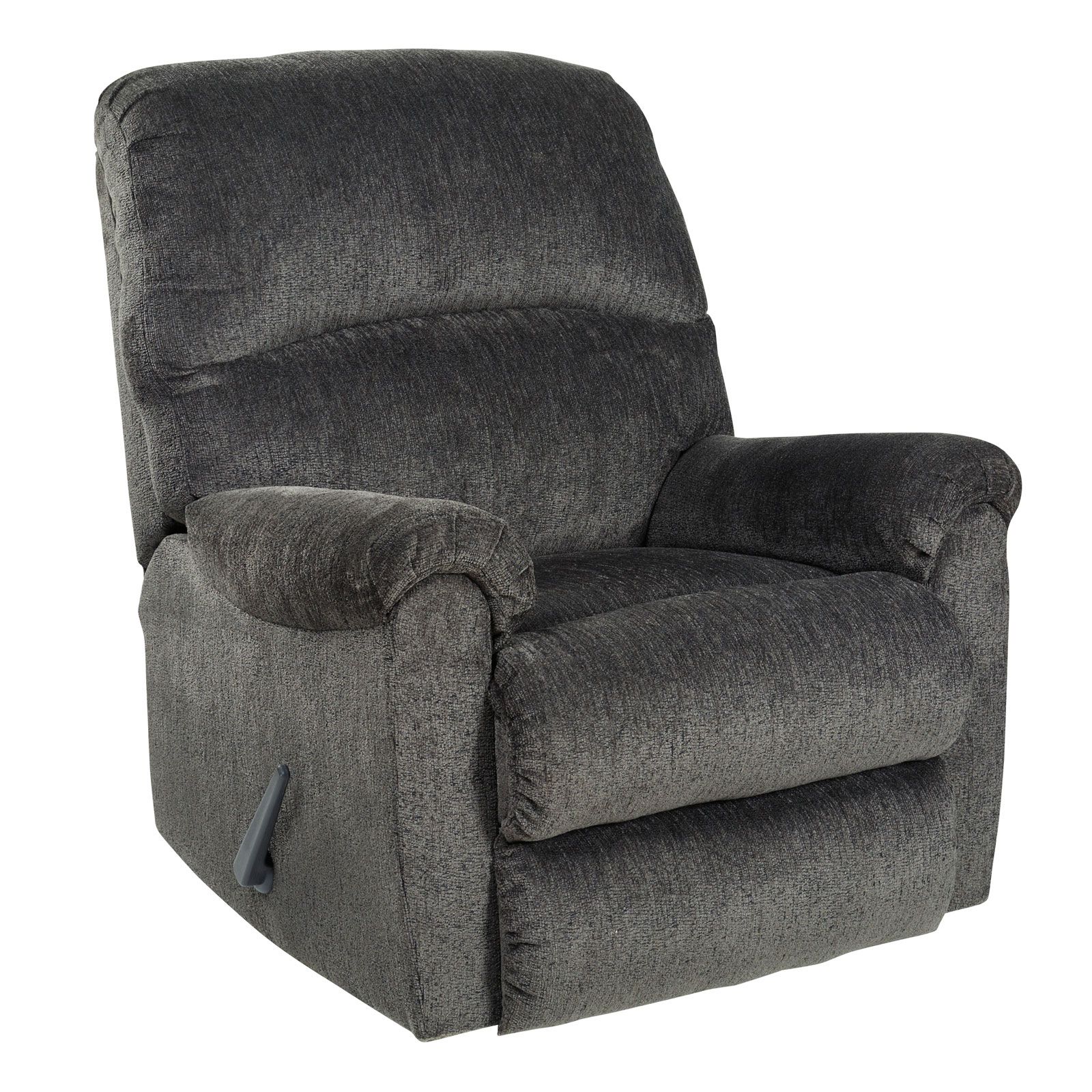 Give your favorite living room an upgrade to comfortable and cozy with the Ballinasloe Collection. Thickly padded arms and a one-pull reclining motion make this recliner ideal for virtually anyone. Upholstered in a platinum gray fabric that is soft and stylish.