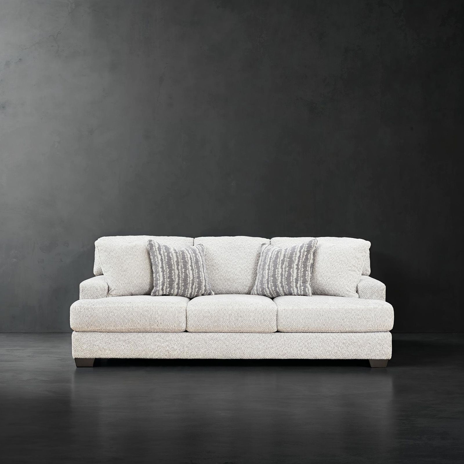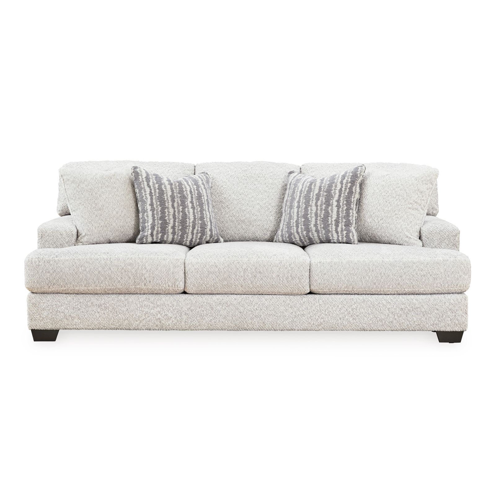 Introducing a loveseat that embodies contemporary elegance and timeless appeal. Designed for those with an eye for fresh style, this piece showcases a light cream color upholstery that exudes a sense of modern sophistication. Its extra plush fabric invites you to sink in and unwind in absolute comfort. It includes two coordinating accent pillows with a feather-fiber blend. Crafted with a corner-blocked frame and loose, reversible backs and seat cushions, this loveseat ensures durability and adaptability. It features exposed feet with a faux wood finish. Welcome this cool addition into your modern space, kick back, and relax in style.
