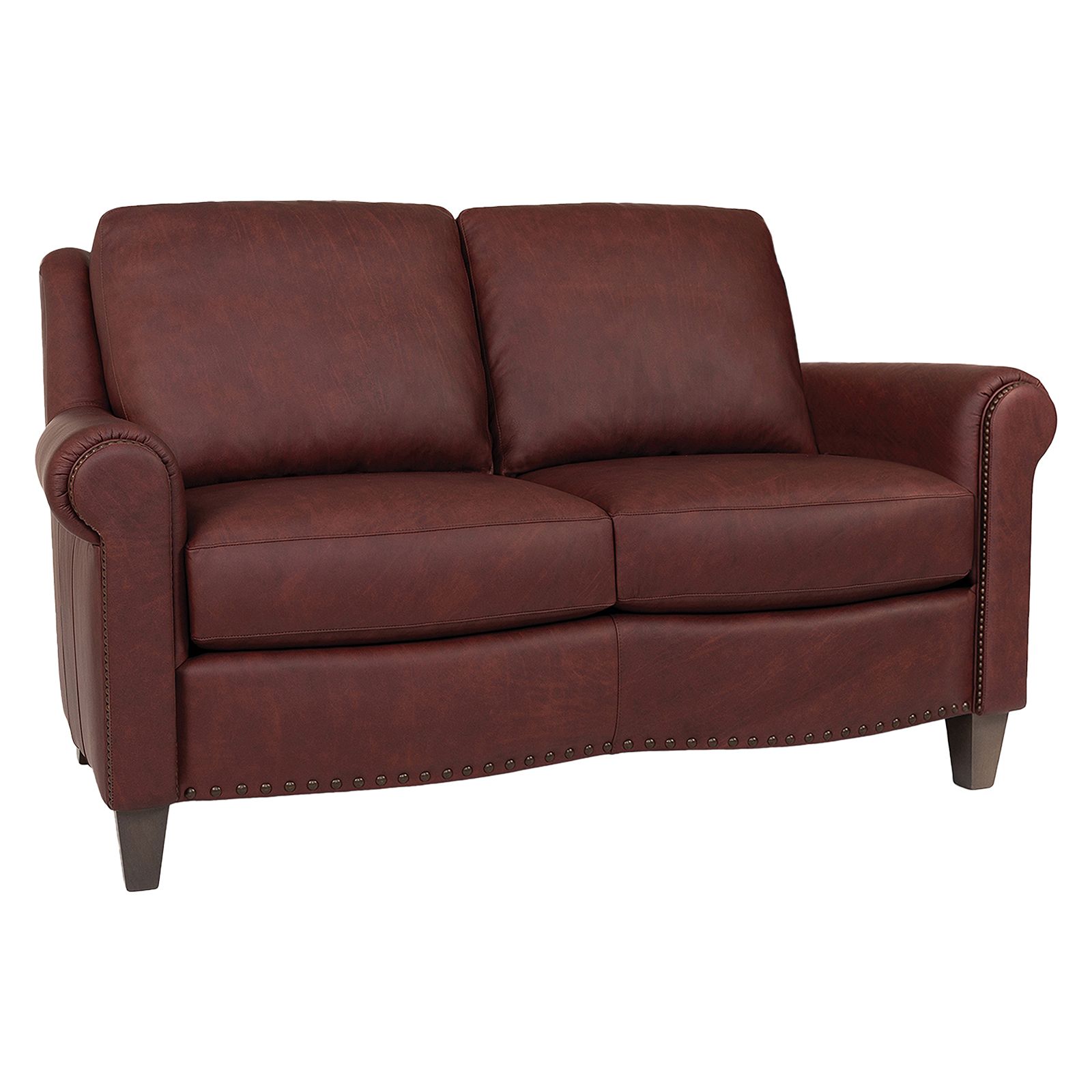 Meet the Burgundy Leather Chair #268 - a statement of timeless elegance. Crafted with 100% top grain pigmented leather in marbled burgundy, it's adorned with rubbed bronze nailheads and built-in tapered legs. Designed for lasting comfort and durability, it features reinforced joints, a solid maple frame, and individual spring seats. Upgrade your living space with the Burgundy Leather Loveseat #268, where luxury meets longevity.
