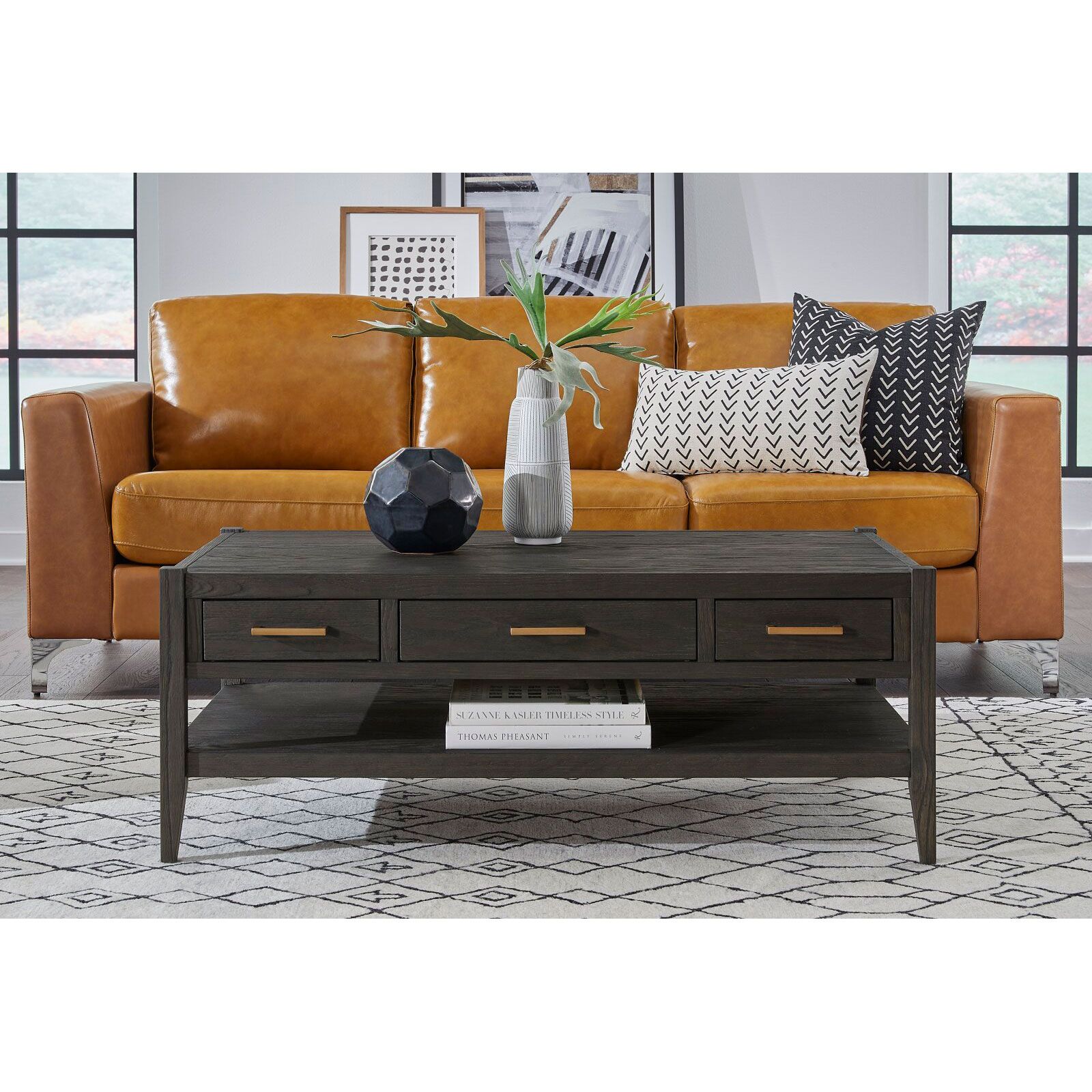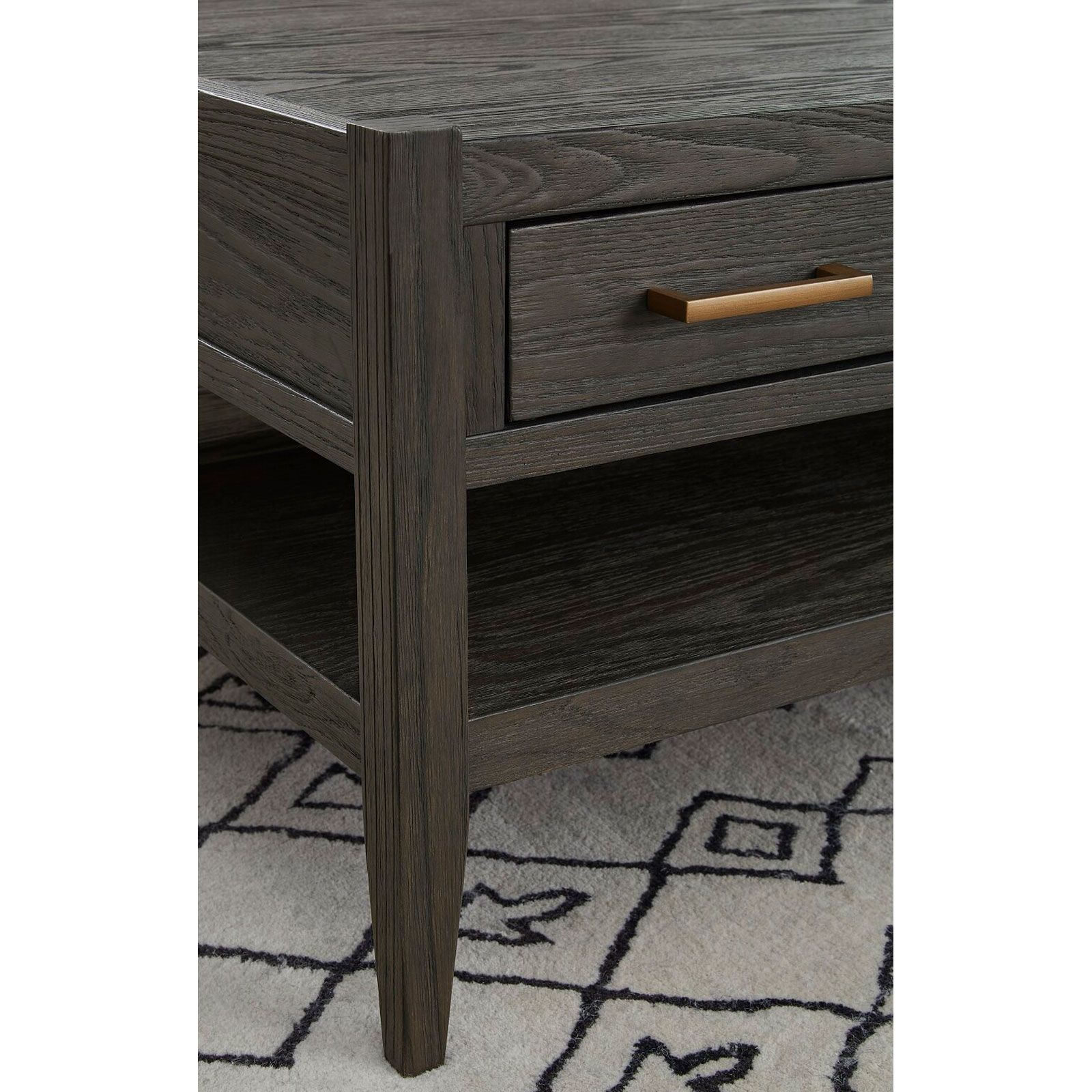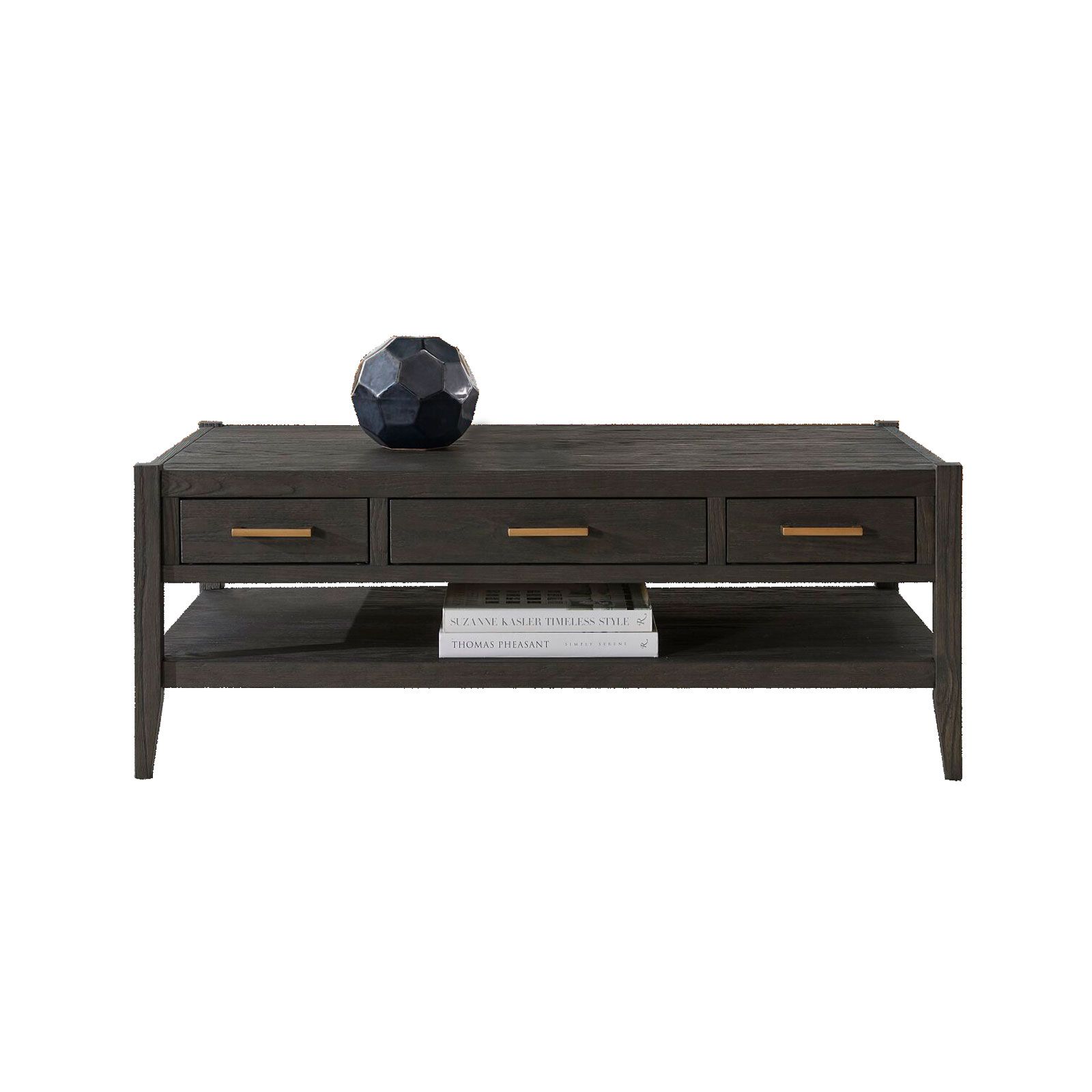 This collection has pieces with plenty of storage and function. The shelves and drawers on selected pieces not only enhance the design but provide further storage capability as well. Oak veneer and Baichun solids in an Espresso finish with vintage brass finished decorative hardware complete the look.