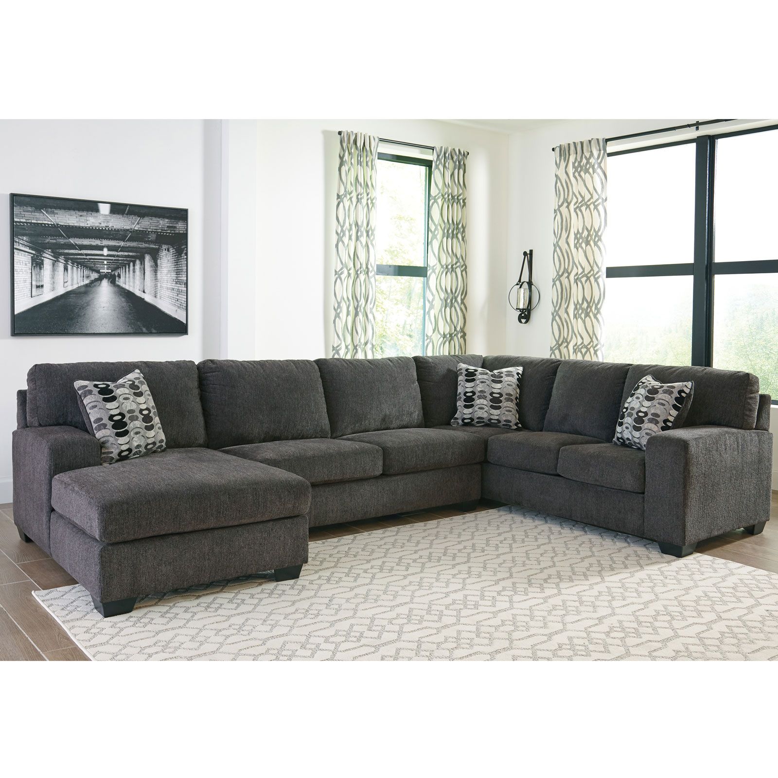 Give your favorite living room an upgrade to comfortable and cozy with the Ballinasloe Collection. Large, rounded corners and plush seats are so inviting. The smoky gray upholstery is perfectly accented by the three included throw pillows. This item is available in the reverse set-up to fit your room perfectly.