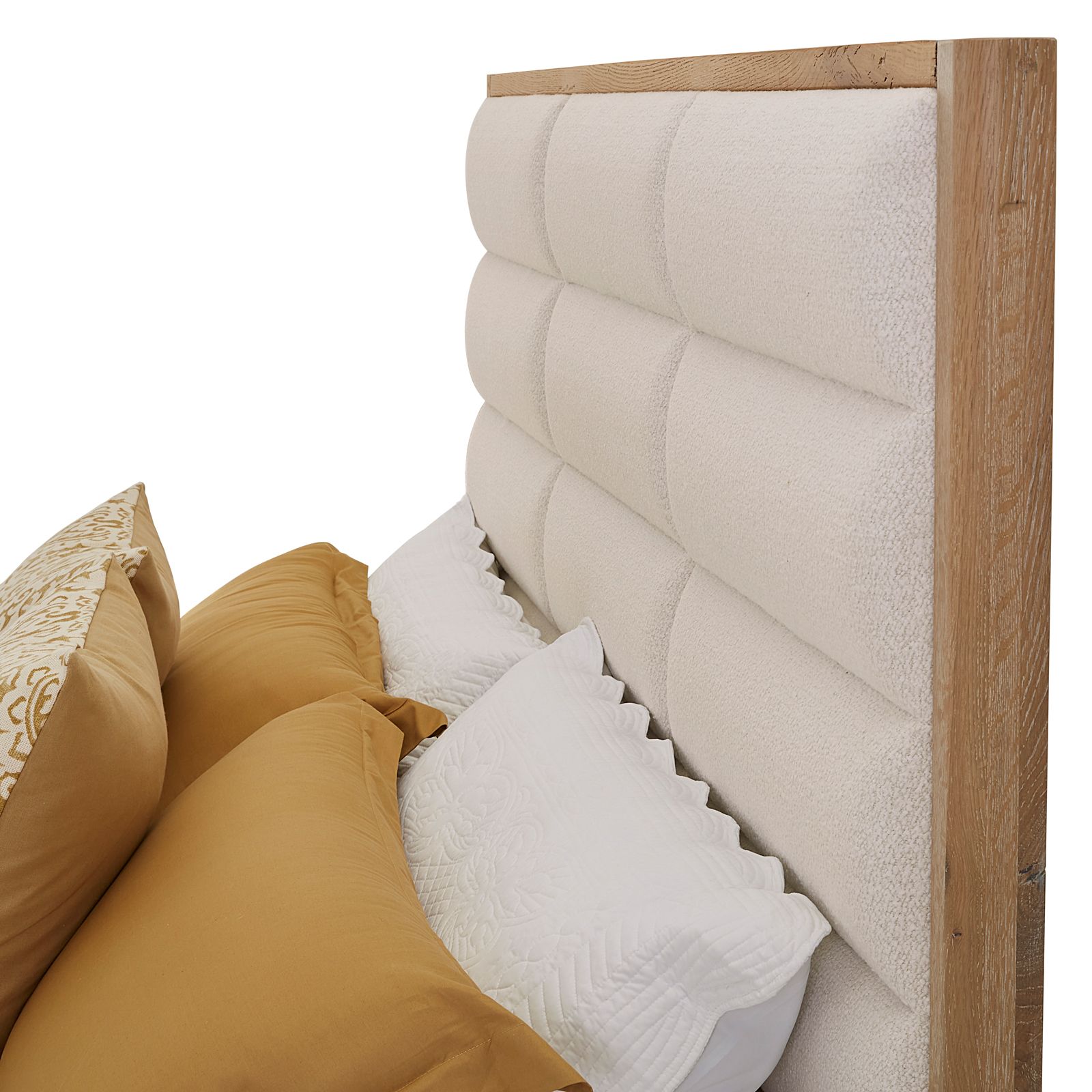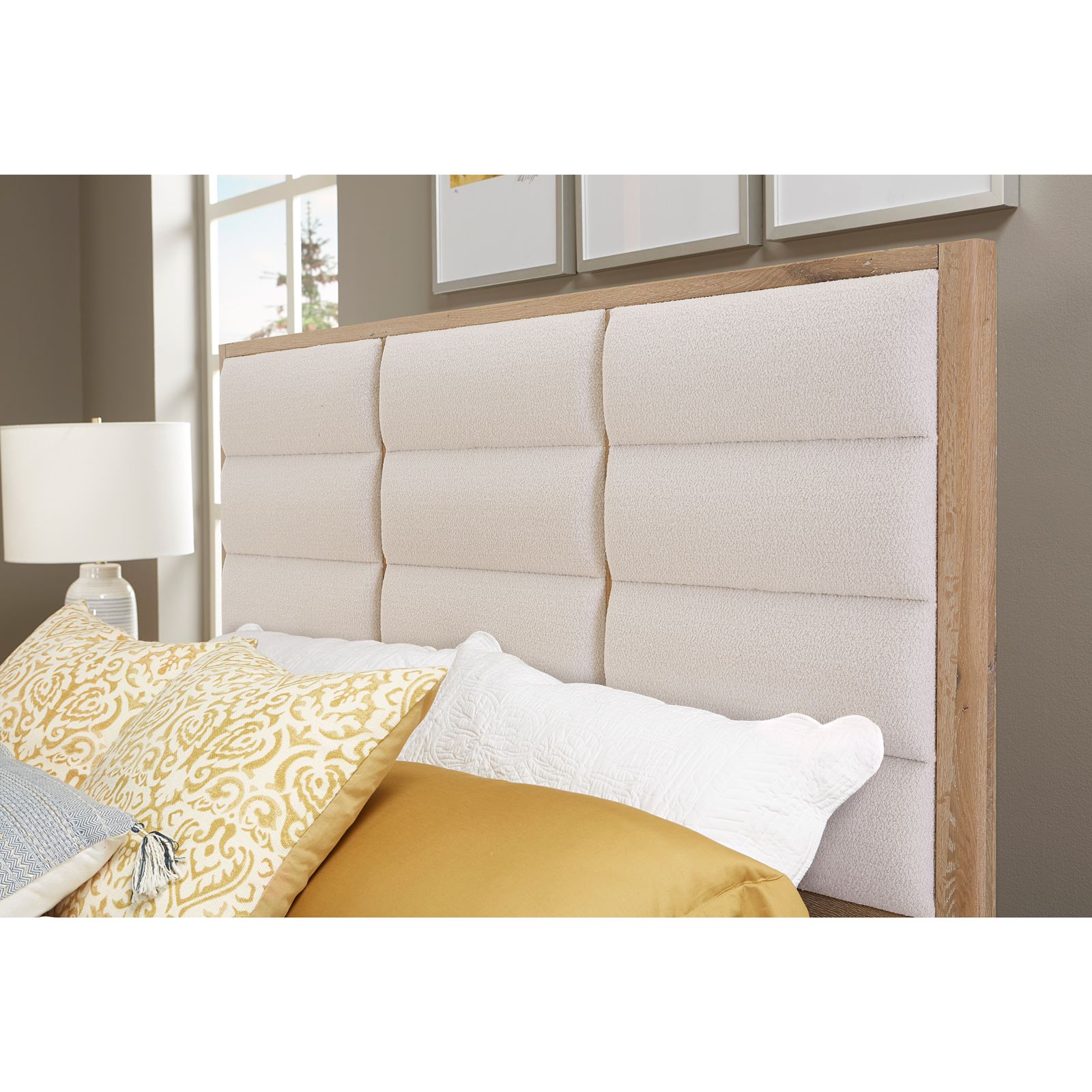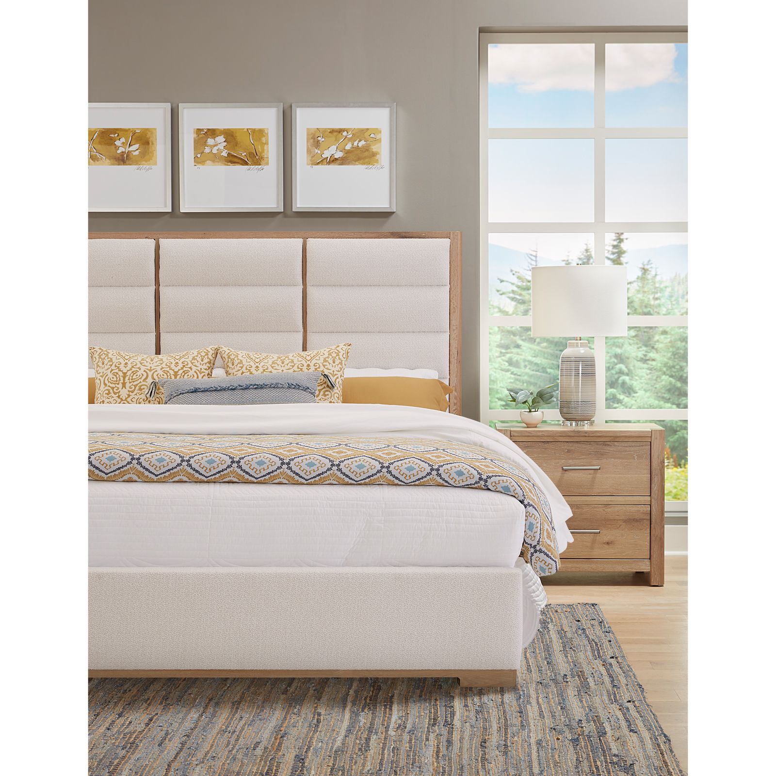 Introducing the Crafted Oak 3-Piece King Bedroom Group by Ben and Erin Napier of HGTV's Hometown. This exquisite set includes a king-size upholstered bed, dresser, and mirror, all handcrafted in Galax, VA, from Solid American White Oak and Oak Veneers with a Bleached White finish. The bed features three upholstered panels on the headboard and a low-profile footboard. The dresser boasts eight spacious drawers with self-closing guides. Nature's touch is evident with splits, cracks, and knot holes, aging gracefully thanks to ATAP (Accelerate The Aging Process). For every tree used, Vaughan Bassett donates one to the Virginia Department of Forestry, ensuring sustainability. Elevate your bedroom with this unique blend of craftsmanship, style, and nature, exclusively with LM Co. Home.