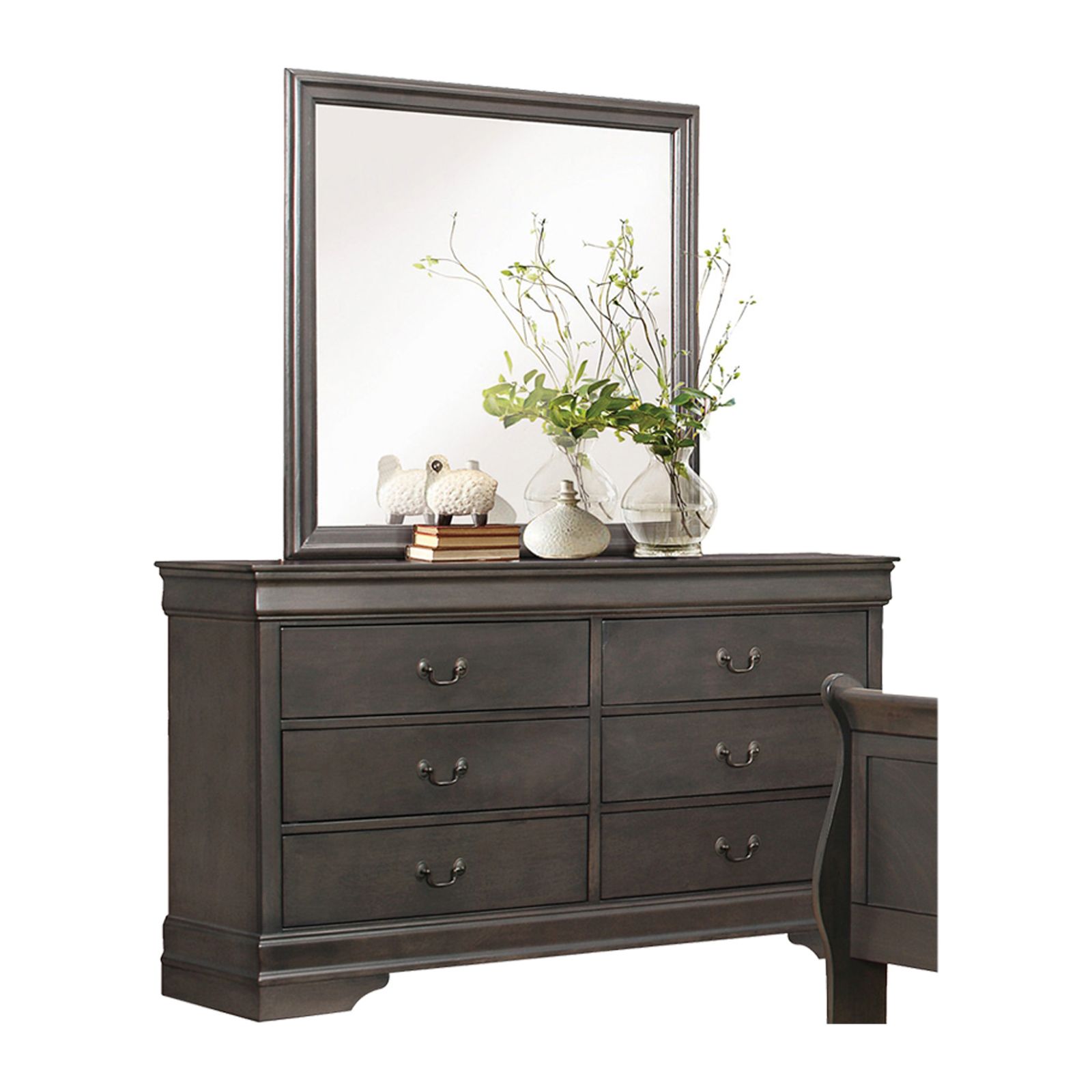 Traditional in design and modest in scale, this dresser takes its design inspiration from classic Louis Phillippe styling. Features a stained gray finish and a lot of flair. With antique brass tone drop handles and distinct framing, this dresser is a perfect addition to your traditional bedroom.