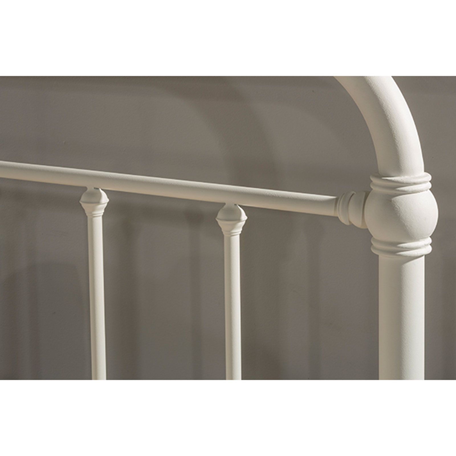 This traditional metal bed will make your room feel bright and airy. The curved posts and tubular style frame bring back original farmhouse style. The soft white finish has a slight texture to it to give it a matte look. Heavy duty metal ensures durability of this bed.